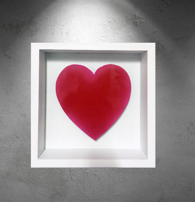 Metal airbrushed bright red & pink floating in a shadowbox frame.