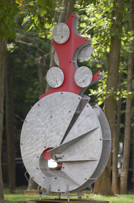 Welded, heavy brushed aluminum and flame red automotive enamel.