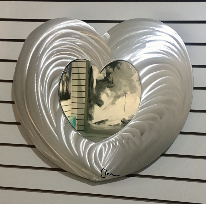 This beautiful heart mirror is high polished with a machine brush finish. Ready to hang. ©Mac Worthington, artist, 2018 Signed & dated. Certificate of Authenticity For further information on this piece or to discuss a custom design please call 614 | 582 | 6788 or email: macwartist@aol.com
