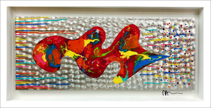 Acrylic enamel on high polished metal shadowbox framed in pearl white. Available. Signed & dated. Certificate of Authenticity. Delivery, hanging & shipping available Studio, Sculpture Park & Gallery, 5935 Houseman Rd, historic Ostrander, Ohio. For further information on this piece or to discuss a custom design please call 614 | 582 | 6788 or email: macwartist@aol.com