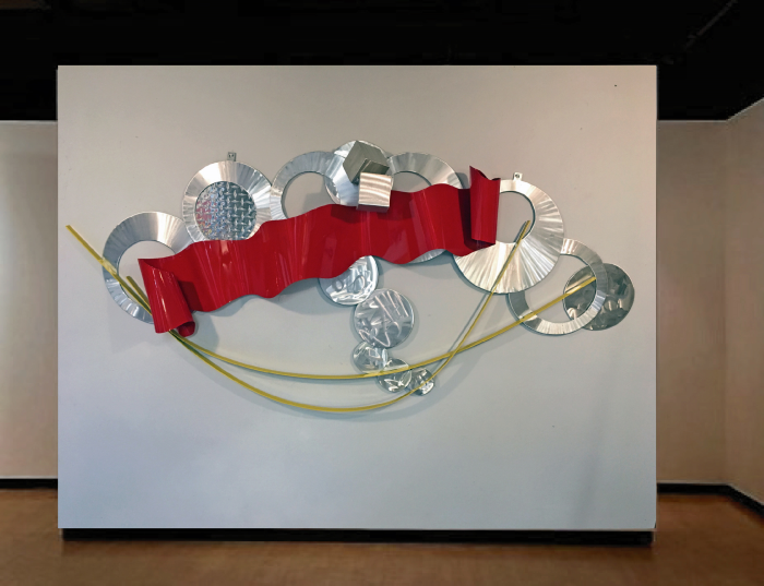 Custom wall sculpture welded with machine brush finish painted automotive flame red & chrome yellow. * designed to be hung horizontally or vertically.