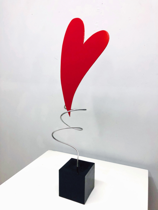 Welded aluminum painted flame red on a solid block. Available. Signed & dated. Certificate of Authenticity. Delivery, hanging & shipping worldwide Studio, Gallery & Sculpture Park, 5935 Houseman Rd, historic Ostrander, Ohio. Here, inspiration is everywhere you look. From the gallery walls to the sculpture park grounds. For further information on this piece or to discuss a custom design please call 614 | 582 | 6788 or email: macwartist@aol.com