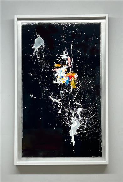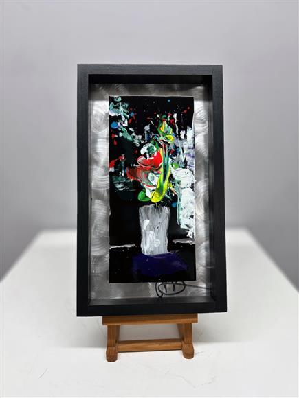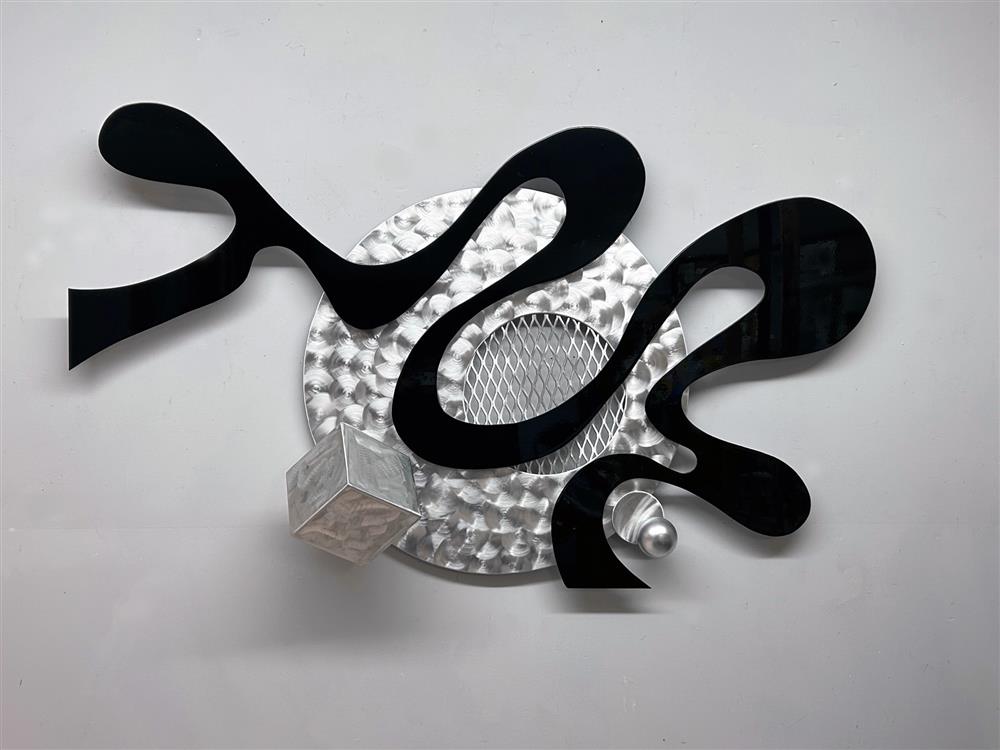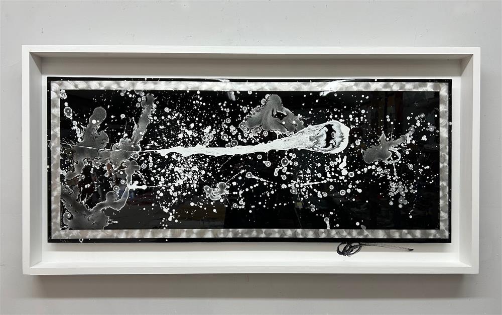 Acrylic enamel on machine brush metal floating in a satin eggshell black shadowbox frame. Ready to hang. Delivery & worldwide shipping is available. 17" x 10" x 2"