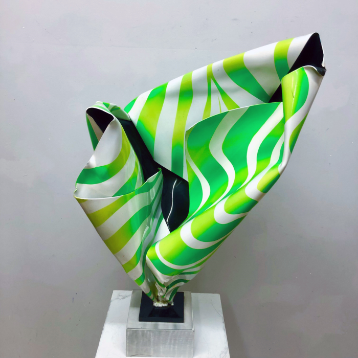 Crushed, welded aluminum, airbushed green and white. This piece may be placed outdoors as well as in. Amazing strong presence.
