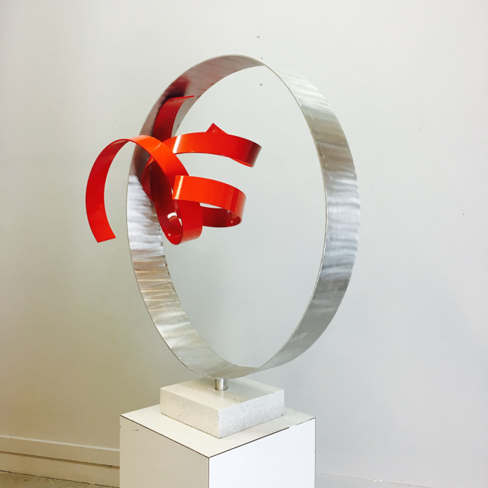 Welded aircraft aluminum painted Dupont automotive flame red enamel on an Indiana limestone base. Signed & dated. Certificate of Authenticity.