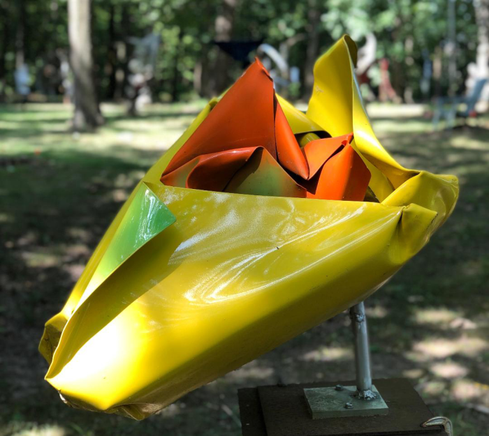 Welded aluminum. Airbrushed chrome yellow, orange and green. Finished with 20 coats of clear enamel For further information on this piece or to discuss a custom design please call 614-582-6788 or email macwartist@aol.com