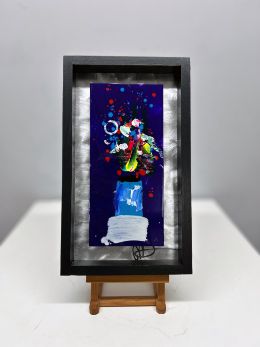 Acrylic enamel on metal shadowbox framed satin eggshell black.