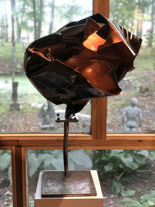 Crushed, welded aluminum on a steel plate base painted metallic copper & pitch black. Suitable for outdoors.
