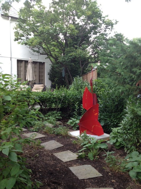 Wonderful, exciting. This piece effectively dominates the space. Welded aluminum. Painted bright flame red.