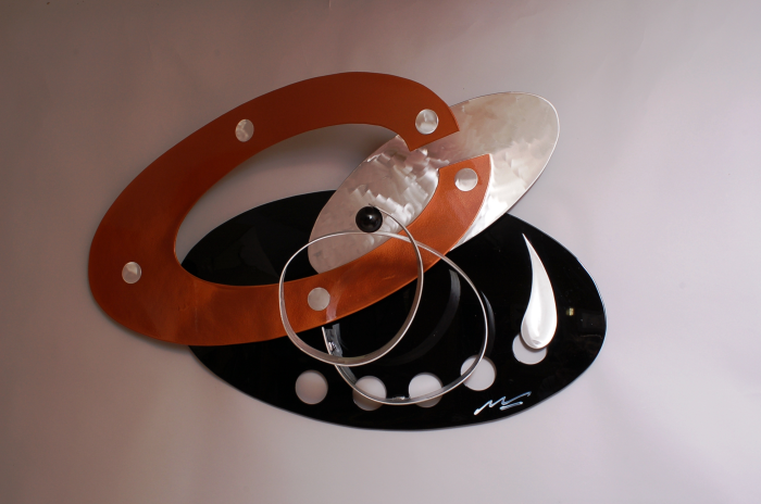 Welded, polished, brushed aluminm. Painted metallic copper and high gloss black This piece may be hung horizontal or verticle