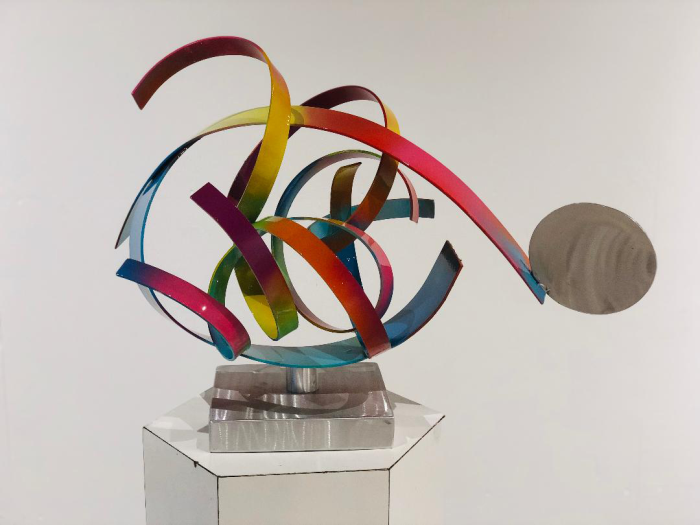 Welded aluminum airbrushed automotive enamel with a silver machine brush finish Perfect table top piece or outdoors ©Mac Worthington, artist, 2019 Signed & dated. Certificate of Authenticity For further information on this piece or to discuss a custom design please call 614 | 582 | 6788 or email: macwartist@aol.com