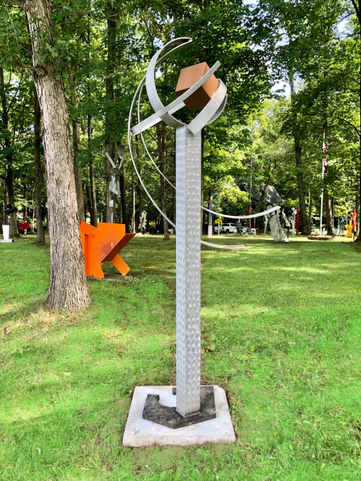 Welded aluminum painted high with a machine brush finish. Available. Signed & dated. Certificate of Authenticity. Delivery & shipping available Studio, Gallery & Sculpture Park, 5935 Houseman Rd, historic Ostrander, Ohio. For further information on this piece or to discuss a custom design please call 614 | 582 | 6788 or email: macwartist@aol.com