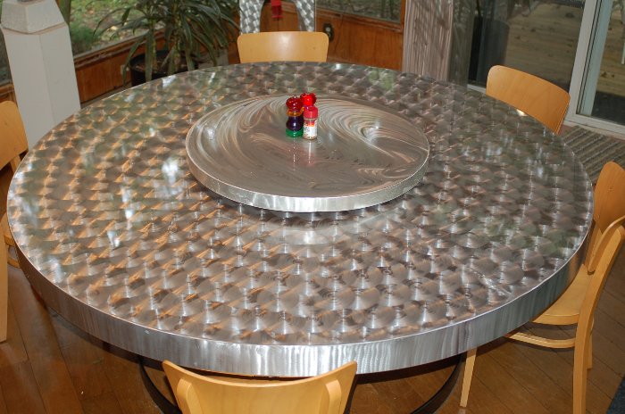 All welded, highly polished, brushed aluminum with 12 coats of clear enamel.